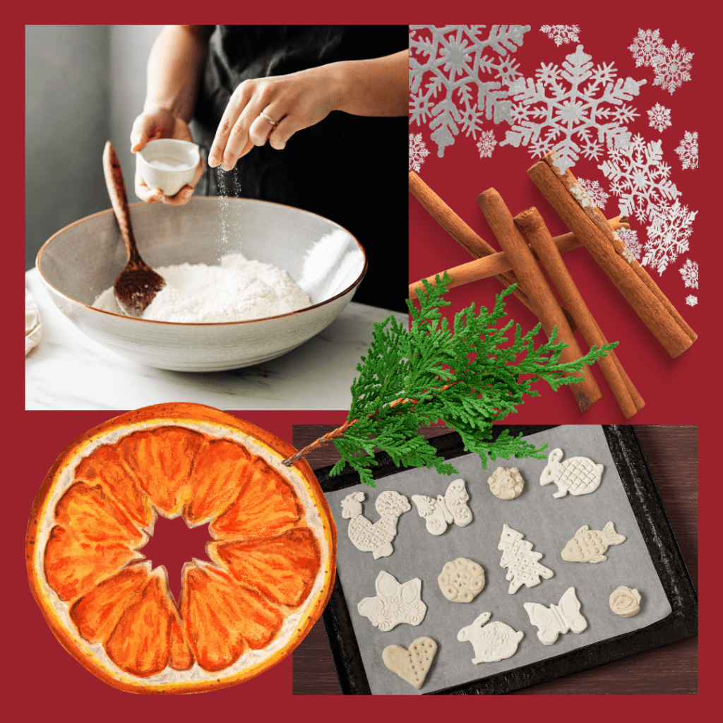 You will need applesauce and ground sweet spices, like cinnamon, allspice, cloves. If you have some out-of-date ones hanging round, those would be ideal. Stir together approximately one cup of applesauce and 3/4 cup ground spices. Adjust the ratio of spice to applesauce until you have a stiff dough. Roll thinly and cut into shapes with Christmas cookie cutters. Punch a hole in the top with a narrow straw or skewer if you plan to hang them. Sprinkle dry spice on a tray lined with parchment and arrange the spice cookies to dry. Turn them every twelve hours. They will take a while to dry. Or you can bake them at 150* in the oven for several hours. You can decorate them more with maybe puff paint or whole spices glued on. Use your imagination.