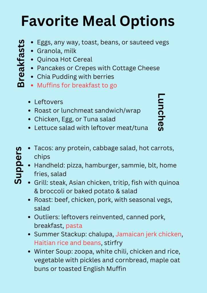 This time around, I did some research. Various articles say we eat less variety than we think. (I linked to two of them in this article.) Less variety actually can lead to more nutritious meals if we choose intentionally. Menu planning can take a lot of time. Making new recipes takes extra brain space. Shopping for new recipes or specific menus can be frustrating. Some of us plan and then don’t follow up. This all amounts to a lot of wasted energy and resources.