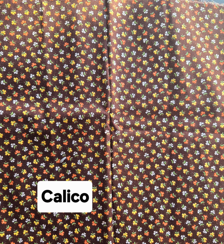 In the US, calico refers to a printed design on fabric. Calico is a small overall floral design printed on cotton fabric with a roller printer. It can also be called ditsy print. It was the least expensive fabric in the 1800’s and appealed to frontier women. With a stain-hiding design, washable and durable, it makes the ideal prairie dress.