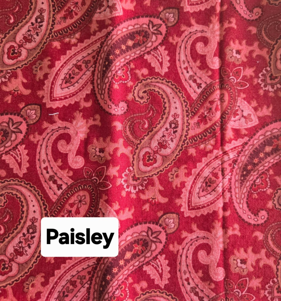 Paisley is a teardrop shape with a curved end. The paisley pattern originated in Persia over two thousand years ago. It can symbolize life, fertility, eternity, freedom and resilience. It was made famous as a pattern on Indian kashmir shawls. Mass-produced imitations of these shawls were made in Paisley, Scotland in the 1800’s, hence the English name of the pattern. After shawls were no longer worn, the pattern continues to be popular on scarves, bandanas, and neckties.